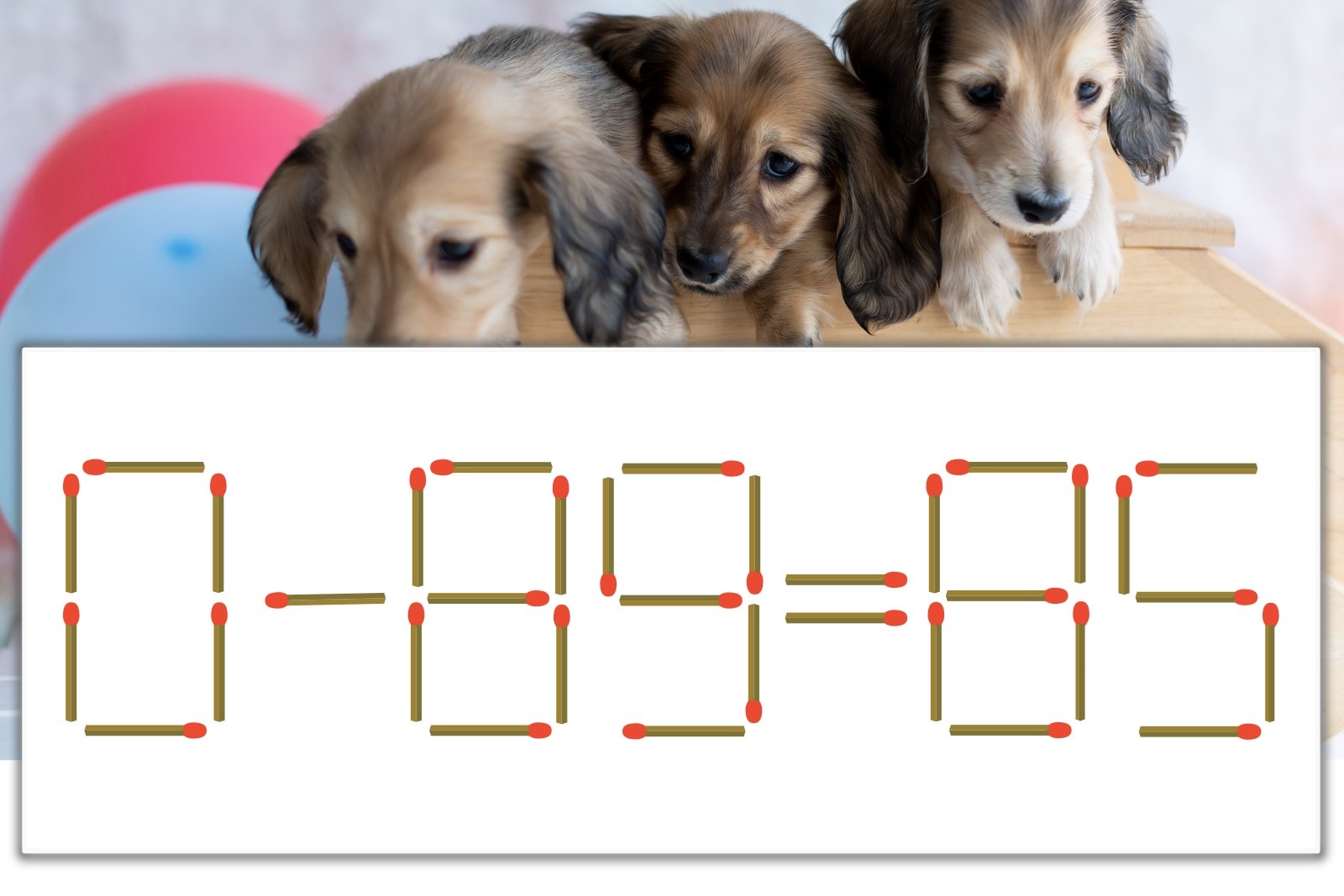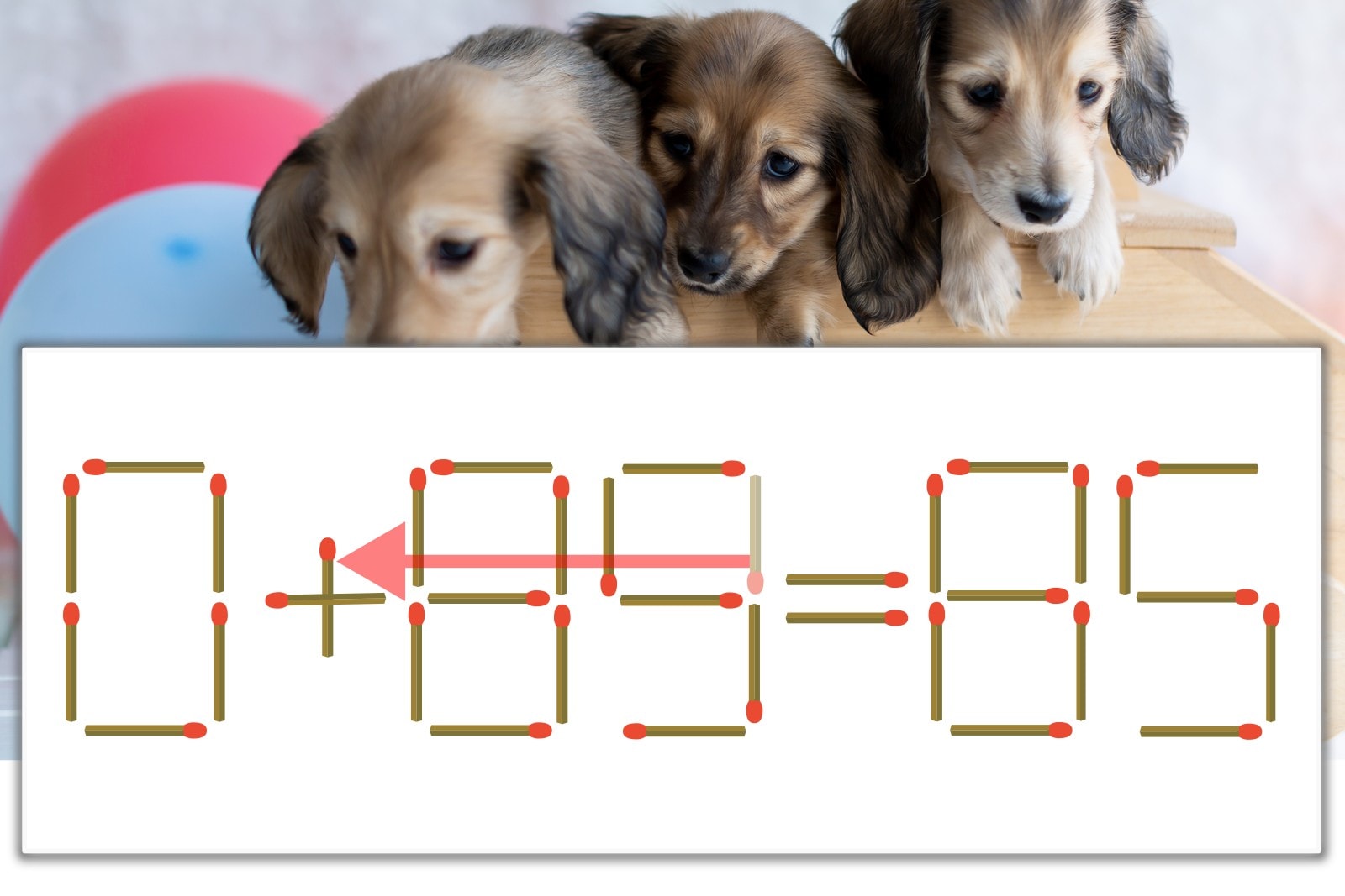 「9」を別の数字に変化させると答えが導き出せます。「9」のマッチ棒を1本移動して、「-」を「+」にしてみましょう。すると、「0+85=85」が成立します。