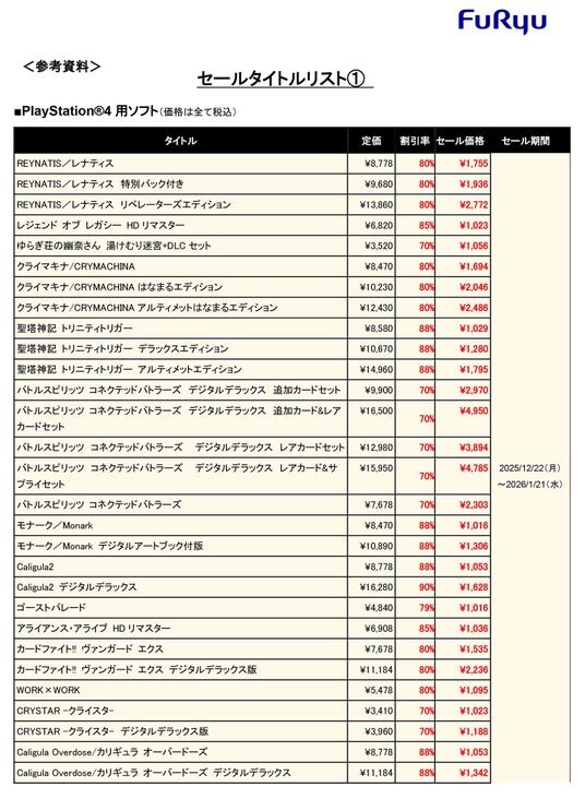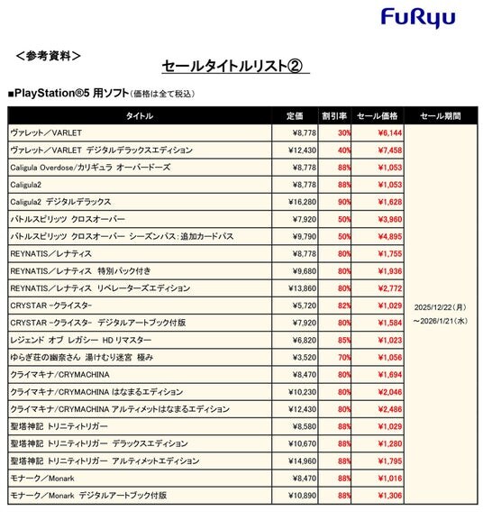 フリュー株式会社(本社:東京都渋谷区、代表取締役社長:榎本雅仁、以下フリュー)は、Nintendo Switch(TM)、PlayStation(R)5、PlayStation(R)4にて発売中のゲームソフトにつきまして、ダウンロード版が【最大90%OFF】になるDLセール“フリュー年末年始大感謝祭”を開催中です。