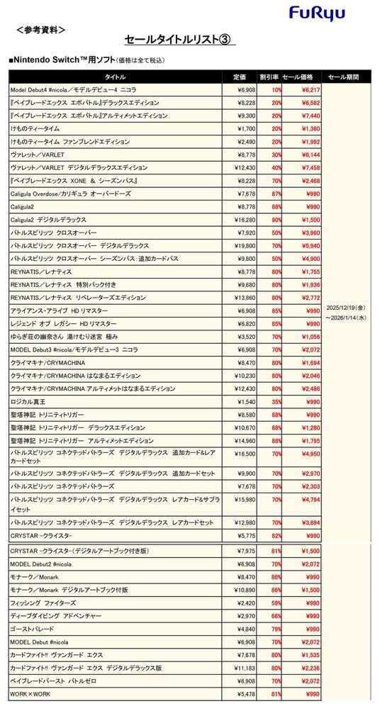 フリューの王道RPGシリーズ『レジェンド オブ レガシー HDリマスター』、『聖塔神記 トリニティトリガー』、『アライアンス・アライブ HDリマスター』と、オリジナルRPG『Caligula2/カリギュラ 2』、『モナーク/Monark』などのNintendo Switch(TM)版が990円(税込)~になる他、最新作『ヴァレット/VARLET』や話題作『REYNATIS/レナティス』『クライマキナ/CRYMACHINA』も過去最大割引など、ダウンロードソフト各種がお得な価格にてお買い求めいただけます。