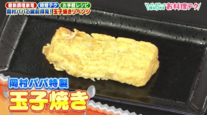 さすが週に2~3回も作っているだけあって、岡村は慣れた手つき。焦がさないように、フライパンを時折コンロから離し、崩れないように整えながら慎重に玉子を巻いていき、キレイでプルンプルンな玉子焼きを完成させた!