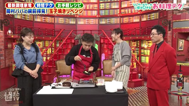 岡村が料理を始めたばかりの頃を知っているなるみは、彼の成長した手際の良さにも味にもビックリ。「進化している!」「め~っちゃおいしい!」「豆乳も感じるし、おいしい!」と目を輝かせた。料理番組『DAIGOも台所~きょうの献立 何にする?』(ABCテレビ)への出演でお馴染みの料理コラムニスト・山本ゆりさんも、岡村の進化を褒めまくり。共演者たちに称賛されて、岡村は鼻高々だった。