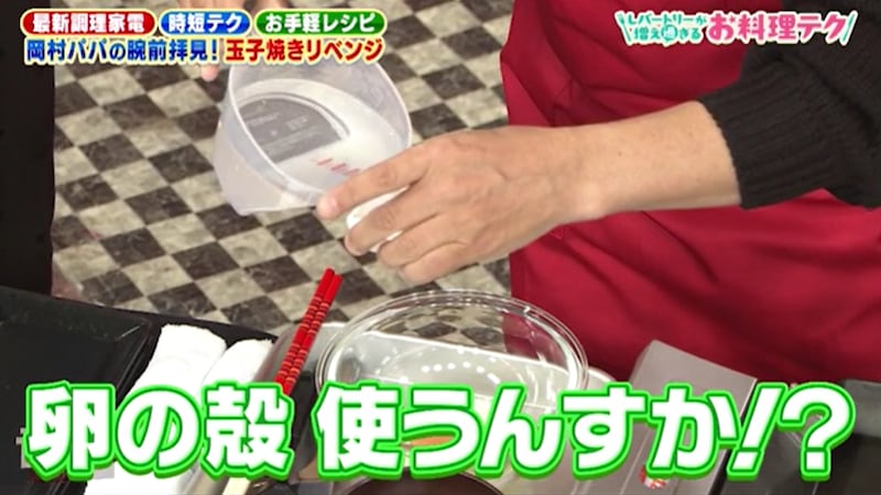 そんな悩める料理パパ・岡村が、普段使っているという、子どもの玉子焼き用ミニサイズフライパンを持参して、料理の腕前を披露! 溶き卵に、まろやかさを出すために豆乳、ふんわり感を出すために水を少々、子ども好みの甘い仕上がりにするために砂糖をプラス。さらに醤油を少々、カルシウム豊富なしらす、子どもが大好きなチーズも入れてかき混ぜ、四隅までしっかり油を行き渡らせたフライパンで焼き始めた。