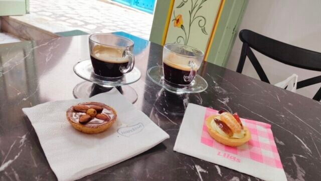 チュニジアでは、だいたいコーヒー1杯の値段が100円以下~250円ほど。どのカフェにもクロワッサンやデニッシュがあり、フード類はコーヒーより安価です。
