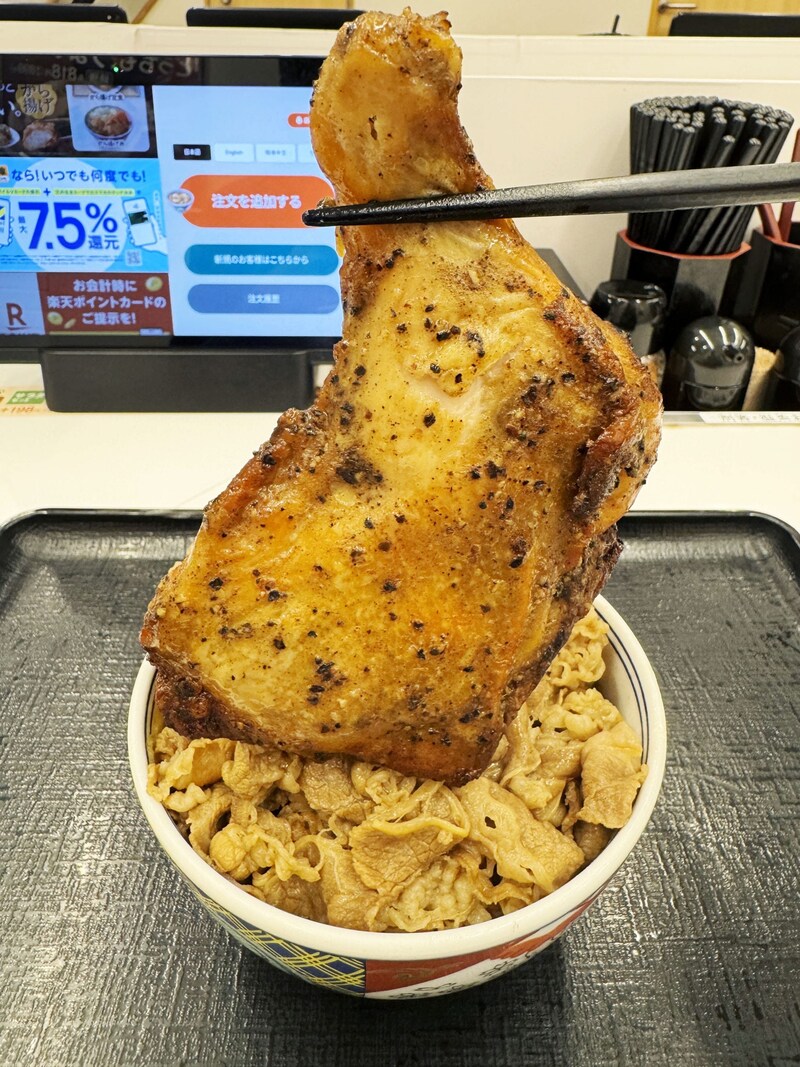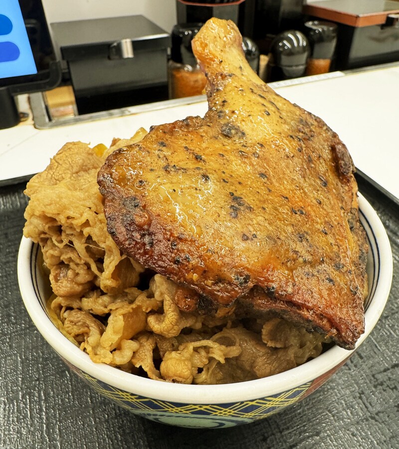牛丼を注文し、そのどんぶりにチキンレッグをのせよう。