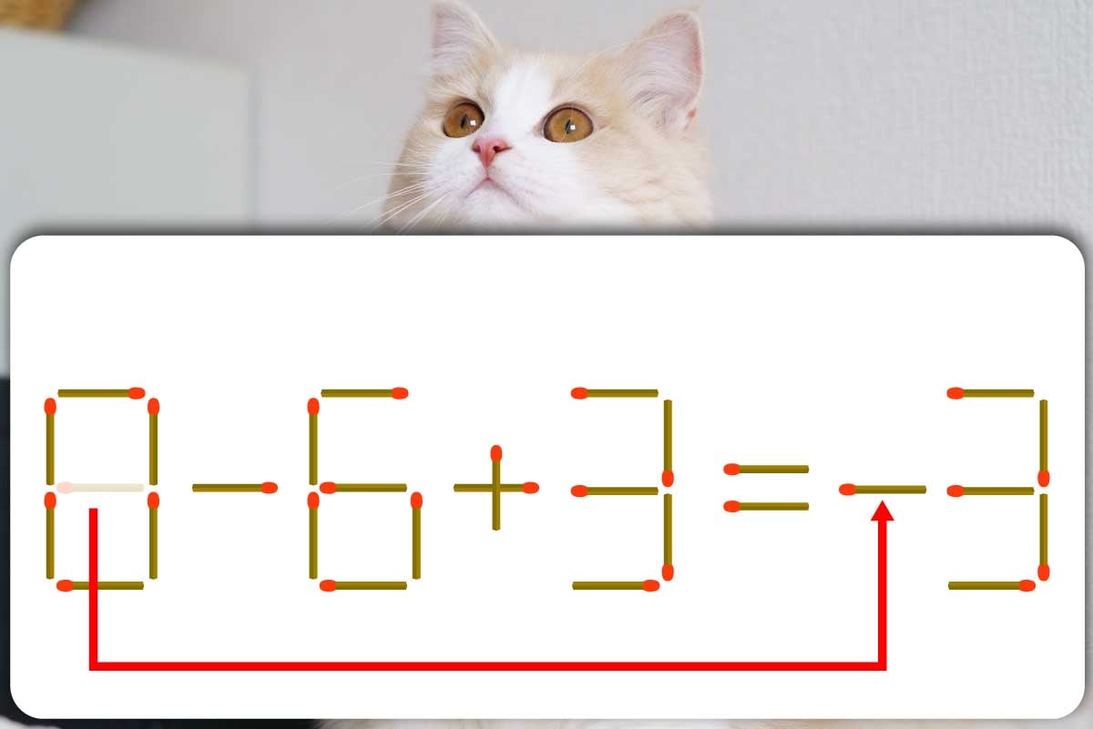 「8」のマッチ棒を1本、「3」の前に移動させて「-」を作り「0-6+3=-3」にする。※解答は複数ある場合があります。
