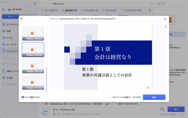 手順2.しばらく待つと、Macパソコンから消してしまったファイルが表示されます。復元前に、写真、ビデオ、ムービー、オーディオ、音楽、ドキュメントなどのファイルをダブルクリックすることによりプレビューが可能です。