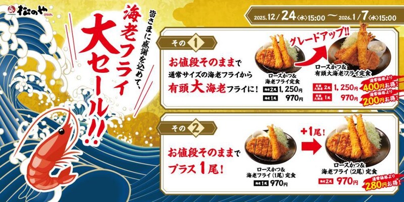 全国のとんかつ専門店「松のや」では、2025年12月24日15時から26年1月7日15時まで、期間限定で「海老海老フェア」を開催します(一部店舗を除く)。