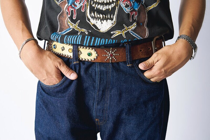 ベルトは、バックルの位置を正面じゃなくて横にずらして留めてる。20年以上続くこだわりの巻き方だね。ゴツいバックルが正面にあるとトップスのお腹部分が変に飛び出るから気になっちゃう。横にずらして留めれば、ベルトの柄や装飾が正面からしっかりと見えるようになるからイイなと思って。古着店で働いてた頃にベルトを作ったこともあったな。自分のデザインをHTCに別注してヴィンテージベルトを使って作ってもらったんだよ。