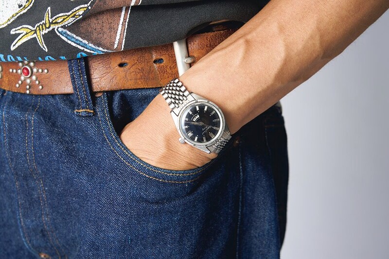 着用しているのは、手巻き式のドレスウォッチ。ここ最近ではよく着けているうちの一本かも。今日穿いているジーンズはかなり色濃い状態だけど、色落ちしたり穴が開いたりしているような古くてボロボロのジーンズを穿く時にも合わせてる。ジーンズがカジュアルすぎる印象を与えるところを、ドレスウォッチが引き締めつつ上品さを加えてくれるから、全体のバランスがうまくとれた仕上がりになるんだよね。