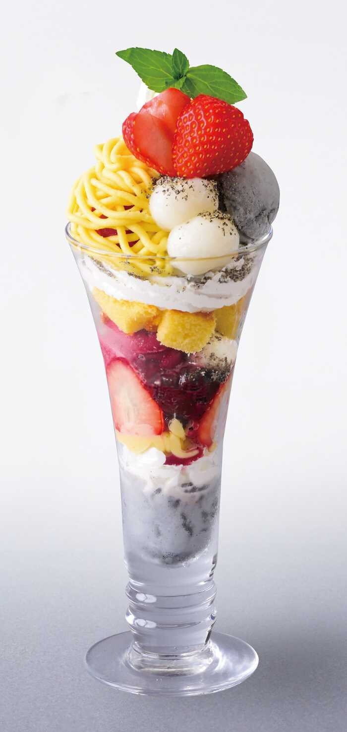 香ばしい黒ごまとモンブランクリーム、白玉やあんこを重ね、苺やカシスの酸味がアクセントに。和洋折衷の豊かな味わいが魅力。