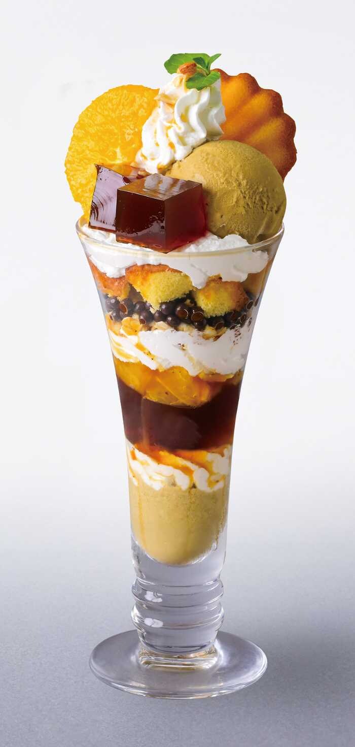 和紅茶アイスと店舗仕込みのゼリー、爽やかなオレンジを合わせた大人の一品。マドレーヌの食感も楽しい秋らしいパフェです♡