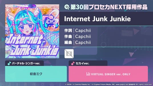 新たなリズムゲーム楽曲として、「Internet Junk Junkie」(作詞・作曲:Capchii)の追加が決定いたしました。「Internet Junk Junkie」は、「一緒に作ろう!第30回楽曲コンテストプロセカNEXT」の採用作品です。