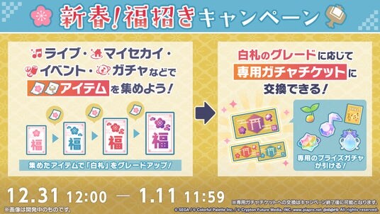 ライブやマイセカイ、イベント、ガチャなどをプレイすることで獲得できるアイテムを使用して「白札」をグレードアップさせ、グレードに応じてお得なプライズ付きガチャを引くことができる専用ガチャチケットと交換可能なキャンペーンを開催いたします。