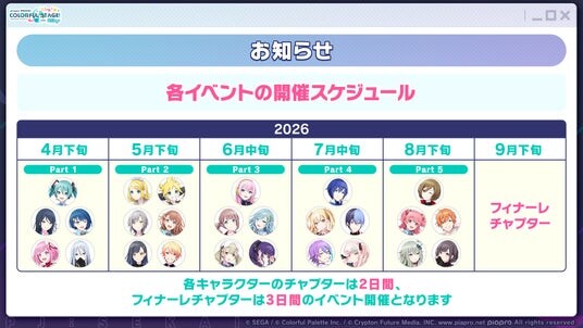 次回のワールドリンクイベントでは、ユニットごとではなくシャッフルメンバーでの開催となるほか、各Partごとに書き下ろし楽曲が登場いたします。また、ワールドリンクイベントの開催に合わせて新登場するメンバーは、ヘアスタイル付きの「期間限定メンバー」を予定しております。