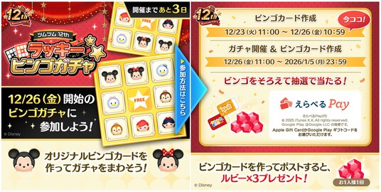 さらに、12月26日(金)に開始する豪華賞品が当たる「ツムツム12thラッキービンゴガチャ」に参加するためのビンゴカードの作成が本日より可能となります。本番開始前にビンゴカードを作成すると「ルビー」がもらえるほか、ビンゴカードを事前にたくさん作成しておくことで賞品への応募チャンスも高まります。