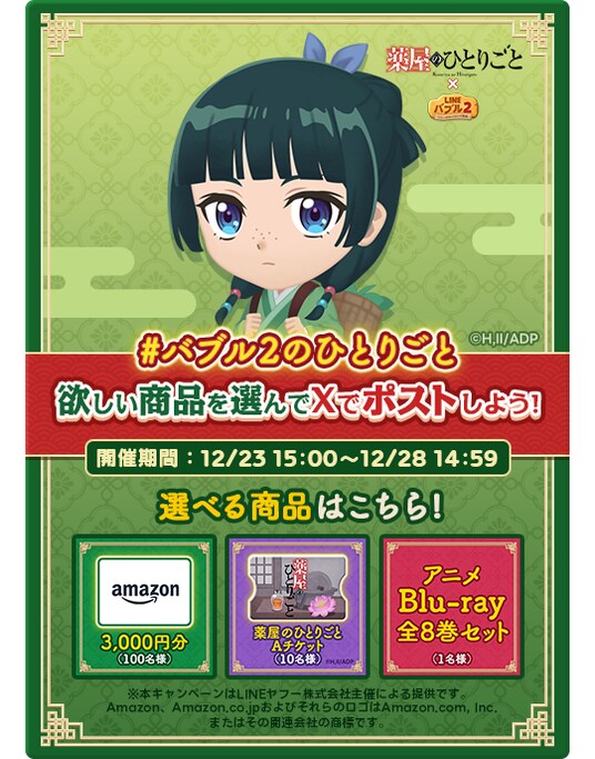 LINEヤフー株式会社は、本日2025年12月23日(火)より、当社が展開するバブルシューティングゲーム「LINE バブル2」(iPhone・Android対応/無料)において、大人気後宮ミステリー、アニメ『薬屋のひとりごと』とのコラボレーションを開催します。