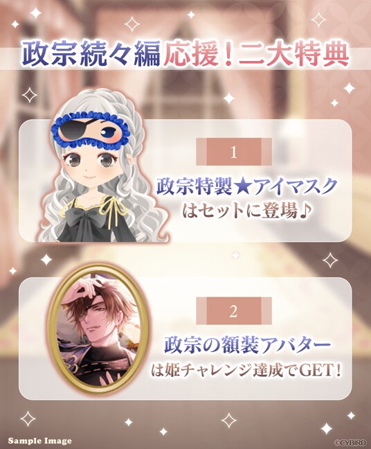 期間限定姫チャレンジでは、長編物語を読んだり、がちゃを回したりすることで様々な特典を獲得することができます。イベント終了までにチャレンジを達成すると、「伊達政宗」の限定アバターアイテムをプレゼントします。