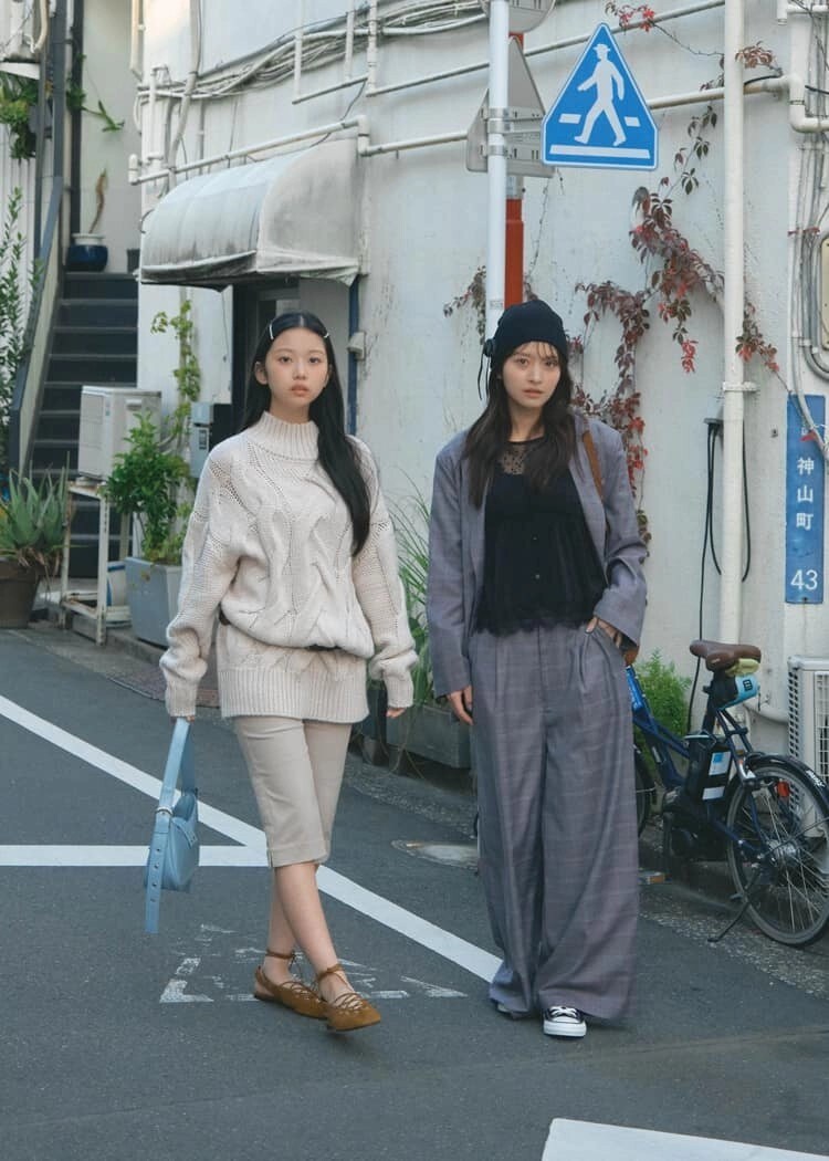 〈右・金川紗耶のコーデ〉チェックジャケット 24,200円、チェックパンツ 18,700円/ともにHONEY MI HONEY サテンレースタンクトップ 8,250円/COCO DEAL(ココ ディール)黒シアートップス 7,590円/LILLIAN CARAT(リリアン カラット)ニットキャップ 3,790円/NADIA FLORES EN EL CORAZON バッグ 38,500円/LEMEME ハイカットスニーカー 6,490円/コンバース〈左・北里琉のコーデ〉ニットミニワンピース 13,200円/COCO DEAL(ココ ディール)カプリパンツ 11,660円/ASURA(HANA KOREA)ヘアピン 各390円/NADIA FLORES EN EL CORAZON ベルト 1,649円、バッグ 3,299円/ともにWEGO ストラップパンプス 8,990円/ZARA(ザラ)