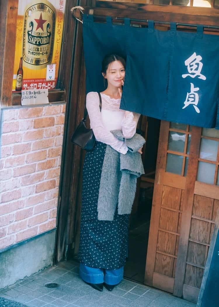 コートを脱いでも可愛くいるのがモテ女子の鉄則♡ ピンク×レースの最強あざとトップスを仕込んで、ボトムはレイヤードでしゃれ感も忘れずに。