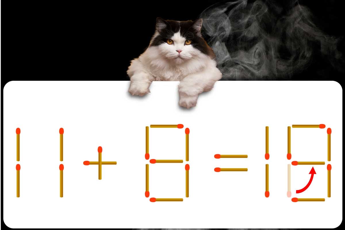 「0」のマッチ棒を1本、移動させて「9」を作り、「11+8=19」にする。解答は複数ある場合があります。