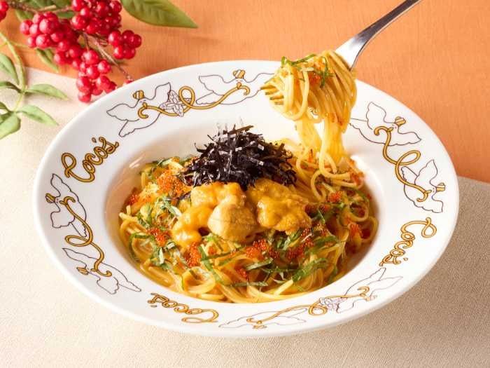 「濃厚ウニの贅沢クリームパスタ」は、ミョウバン不使用のウニをたっぷりトッピングした贅沢な一皿。ウニクリームソースには濃口醤油とたまり醤油の2種を使用し、コク深く奥行きのある味わいに仕上げています。