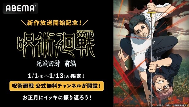ABEMAが2026年1月1日(木)より『呪術廻戦』公式無料チャンネルを期間限定で開設することがわかった。
