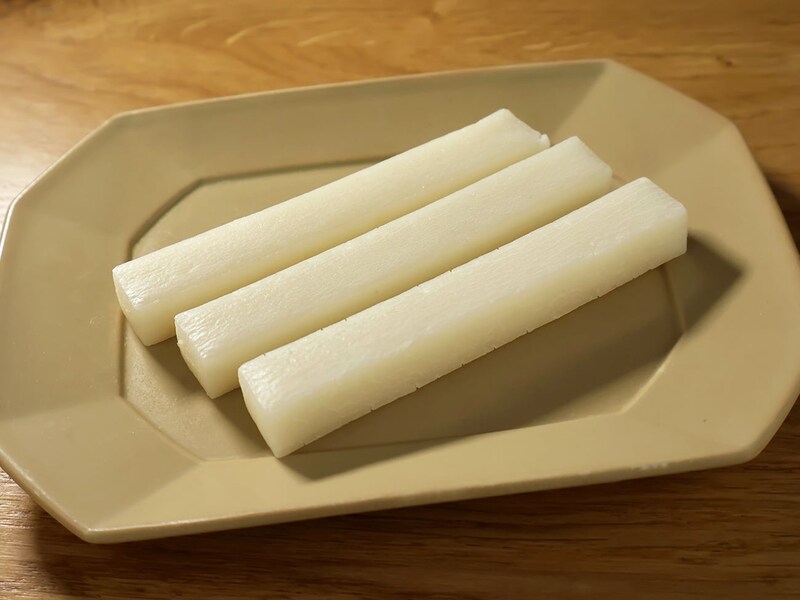 いまだかつて見たことない食べ物の姿ですが、「サトウの切り餅いっぽん」はすでにアブラをまとって表面テカテカ。いい感じに馴染んでそうです。