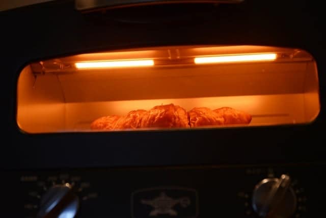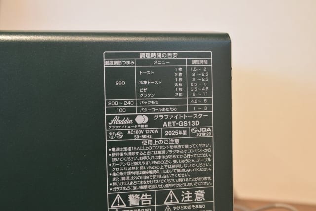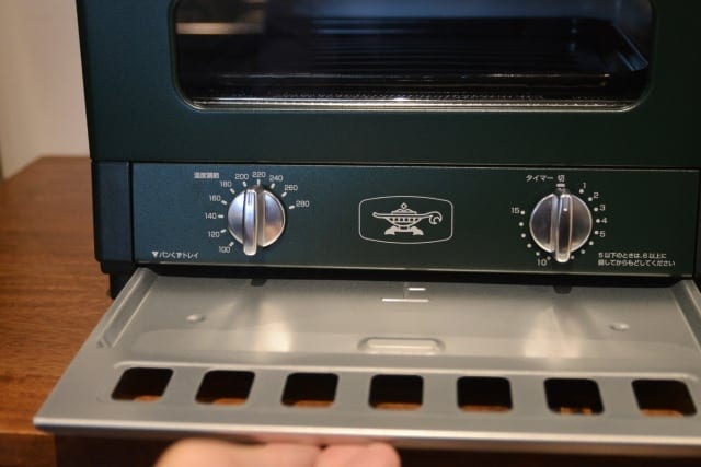 まずは、普通にトーストを焼いてみましょう。操作はシンプルで、温度を決めて(温度調節つまみを回す)タイマーつまみを回すと上下のヒーターで加熱が開始されます。代表的なメニューについては、調理時間の目安が本体側部に書かれていますので、たまにしか焼かないものでも大丈夫。