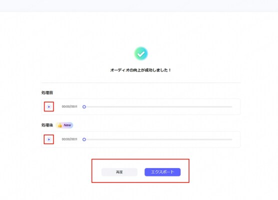 処理後の音声を再生して確認。満足でない場合は再度生成できます。問題なければダウンロード可能。