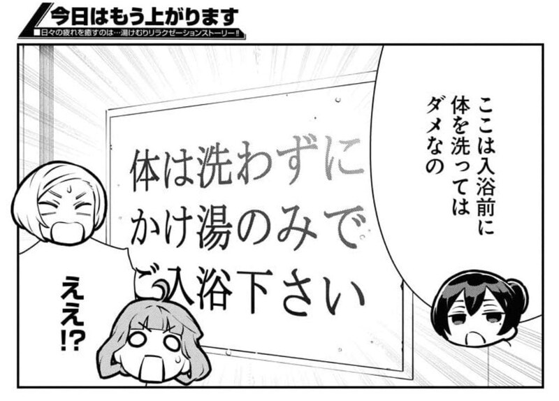 人気漫画「今日はもう上がります」(原作:オクショウ先生 / 作画: 吐兎モノロブ先生)は、登場キャラクターたちが温浴施設を体験していく銭湯・温泉ガールズコメディ。そのなかで、温泉に入るとき体を洗わないエピソードが展開し、注目を集めています。