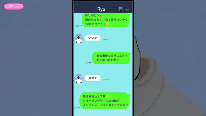 デートシーンでは、ひなたちゃんの操作が解禁されます。待ち合わせ場所にいないリョウ君から「ヤニ吸ってる」とメッセージが来ますので、喫煙所まで迎えに行ってあげましょう。