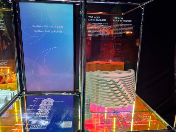 3番目の展示室では、時期によって異なる展示が行われています。この日は、3Dプリントで作られた赤サンゴ礁再生プロジェクト用のレンガや、2025年にスイス・アルプスの村で建築に用いられたロボット技術の一部を紹介。実際に触れることもできます。※企画展「Planet(地球)」は万博終了まで実施予定。
