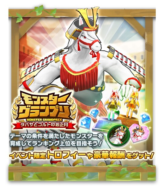 「モンスターグランプリ 『タバサとコルトのお正月』」を開催します。前半、後半で3つずつ用意されたテーマに沿ってモンスターを育成完了し、「いいね(総合力を元にしたポイント)」でランキングを競います。月の前半、後半を合算した総合ランキングにより獲得できる専用トロフィーには総合ランキングの順位が保存され、いつでも確認することができます。イベントの詳細はゲーム内にてご確認ください。