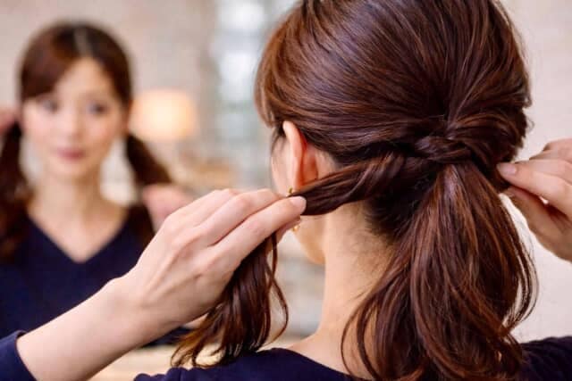 低めシニヨンを作る際は、最初から完璧にまとめようとしないことがポイント。髪をひとつに集める段階では、少しラフさを残しておくと、仕上げたときに固く見えません。