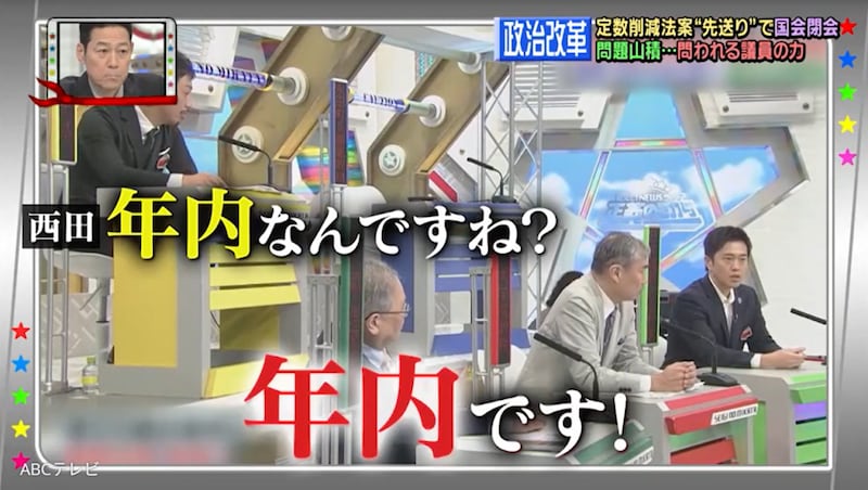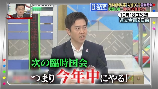 連立前に吉村代表は、2025年内の法案成立を放送電波に乗せて宣言していたため、結果を残せず憤慨。しかし法案が先送りになっても、「思いは全く変わっていません。今回は結論が出なかったけど、これ延長戦ですよ。絶対決着をつけてやろうと思っています」とカメラに向かって宣言した。