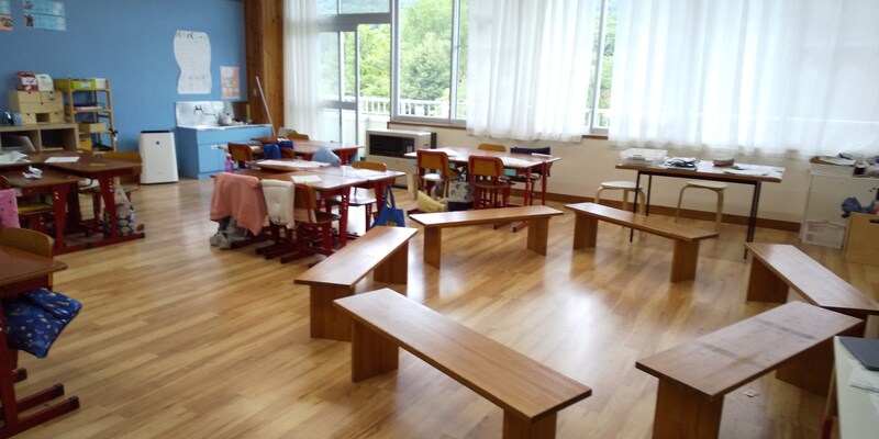 子どもたちが学び方を選択できる教室レイアウトの例。中には、床に座り、ベンチを机のようにして使う子もいるそう。通常の椅子をサークル上に並べて実施することもできる(写真提供:青山新吾)—— 子どもと接するときに意識すべきことはありますか。