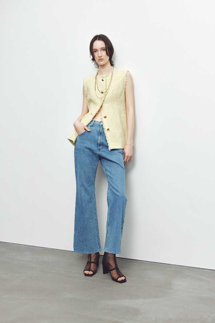 【Lee|FRAY I.D】Denimは2型展開で、どちらも税込23,980円。ワイドとフレア、それぞれ異なる魅力で脚長効果を狙えます。