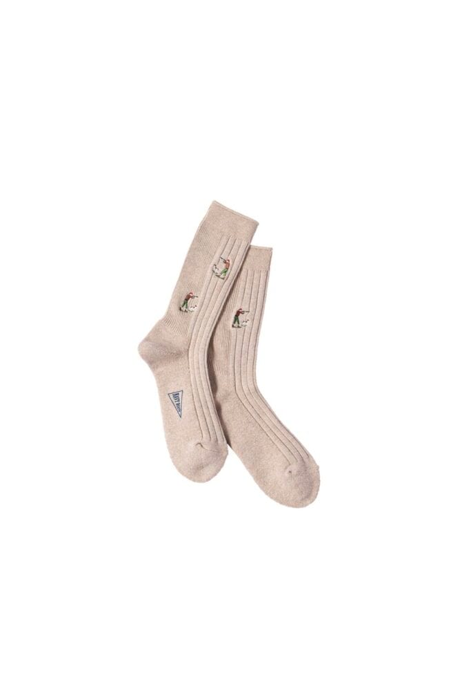 ブランド定番のリブパイルソックスをベースに、ハンターの姿を描写した新モチーフを刺繍。希少なリブ編み機を使用し、部分に応じてリブ編みの針数を変えたり、履き口に太めのゴムを採用するなど、細部へのこだわりも半端ない。2970円(ネイビールーツ Instagram@navyroots)