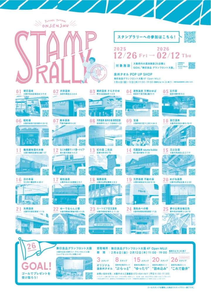 大阪府内の温浴施設25カ所(詳細は公式サイトを確認)、無印良品 グランフロント大阪(ゴール)