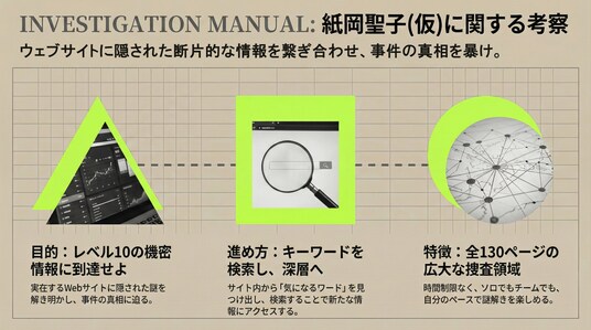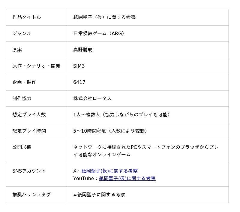 株式会社SANKYO(本社:東京都渋谷区 代表取締役社長:小倉敏男)は、ARGクリエイターSIM3氏と共同制作した日常侵蝕ゲーム『紙岡聖子(仮)に関する考察』を、2025年12月25日19時に公開いたします。