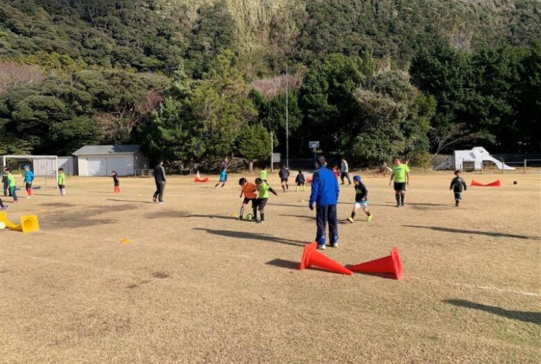 チームのコーチ2人がフェリーや飛行機などを使って訪問。未就学児や小学生、中高生など経験の有無に関わらず幅広い子どもたちにサッカーを教えているという。