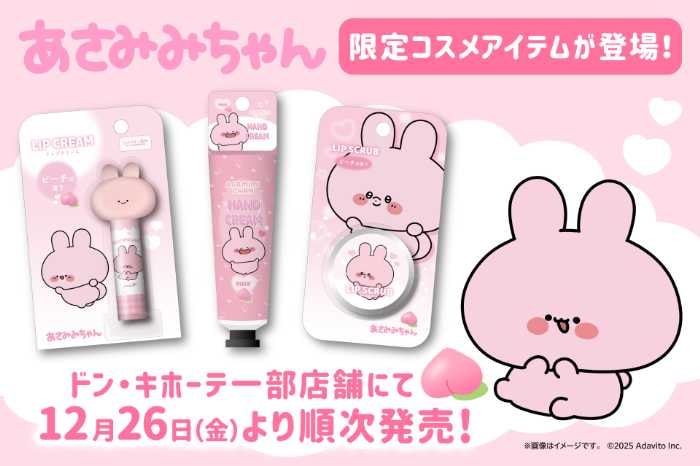 2025年12月26日(金)から、ドン・キホーテの一部店舗で「あさみみちゃん」限定描き下ろしイラストを使用したコスメ雑貨が販売されます!ピーチの香りが楽しめるリップクリーム、ハンドクリーム、リップスクラブの3アイテムが登場。それぞれのアイテムには可愛いマスコットがついて、見た目も使い心地も満点♡価格も手頃で、気軽に購入できるのが嬉しいポイント!ドン・キホーテの各店舗で購入可能なのでぜひチェック♪
