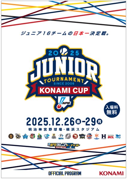 12月26日(金)から明治神宮野球場と横浜スタジアムで開催する「NPBジュニアトーナメント KONAMI CUP 2025」に向けて、大会公式グッズ第2弾を大会初日の12月26日(金)から発売しますので、お知らせいたします。