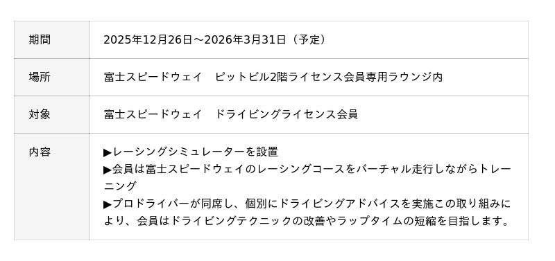 eスポーツ事業に取り組む通信事業者の中部テレコミュニケーション株式会社(本社:愛知県名古屋市、代表取締役社長:中島弘豊、略称:ctc)と、日本を代表する国際サーキットのひとつである富士スピードウェイ株式会社(本社:静岡県駿東郡小山町、代表取締役 社長執行役員:酒井良)は、「レーシングシミュレーター+ドライビングアドバイス」の実証実験を、2025年12月26日から開始いたします。