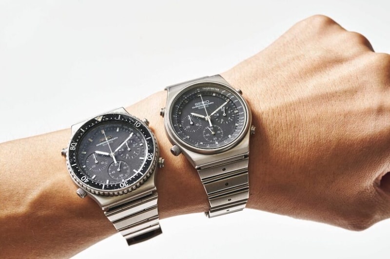 1982年に発売したセイコー初のクオーツクロノグラフ、『SPEEDMASTER』というモデル。その最初期が7A28という品番で、左がダイバーベゼル付きの7A28-7040、右がベゼル無しの7A28-701A。他にも様々なバリエーションが存在し、中にはジウジアーロがデザインしたものも。英空軍は1980年代半ば〜’90年に7A28-7120を採用した。