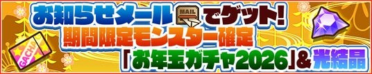2026年1月1日(木)0:00 ~ 1月15日(木)13:59の間にログインした方に、「光結晶」10個に加え、「お年玉ガチャ2026」をお知らせメールにお届けします。「お年玉ガチャ2026」は期間限定モンスターのみがラインナップされ、すべてLvMAX & スキルLvMAXで登場。過去に一度も入手したことのないモンスターが優先して出現する特別なガチャです。