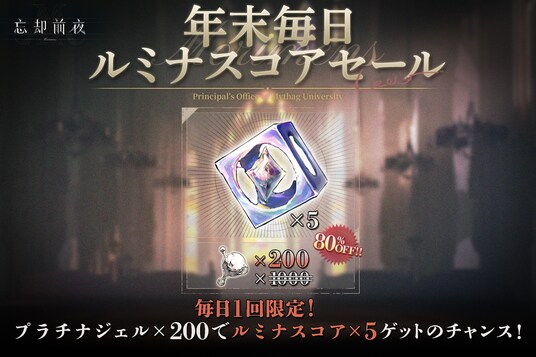 ショップ「行商交換」にて、期間中毎日1回限定で「ルミナスコア5個」がプラチナジェル200個で購入できるセールを開催!