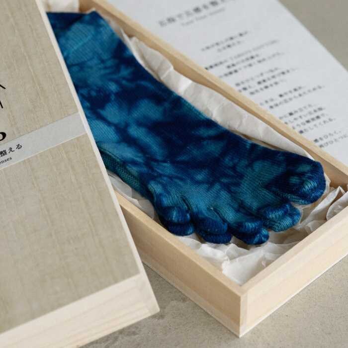「五指で五感を整える」は、無農薬栽培のTABIO’S COTTONを使用し、徳島の天然藍による灰汁発酵建てで深く染め上げた五本指ソックス。緩やかな編み立てにより、脱ぎ履きしやすさにも配慮されています。