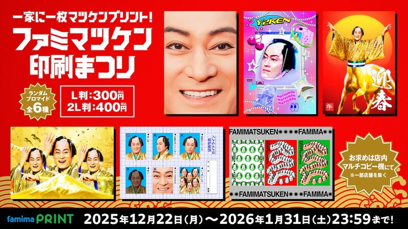 ファミリーマート店内マルチコピー機サービス「ファミマプリント」で、松平健さんのさまざまな表情をデザインした、ファミマオリジナルのブロマイドやステッカー全6種類を発売中です。人気の証明写真風や、年賀状にも使える「マツケンタウロス」など、遊び心たっぷりなデザインがラインナップ。
