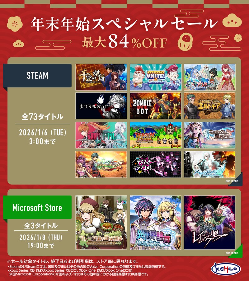 この度ケムコでは、PlayStation Store、My Nintendo Store、Steam、Google Play、App Storeなど、各プラットフォームにて「年末年始の特大セール」を開始いたしました。
